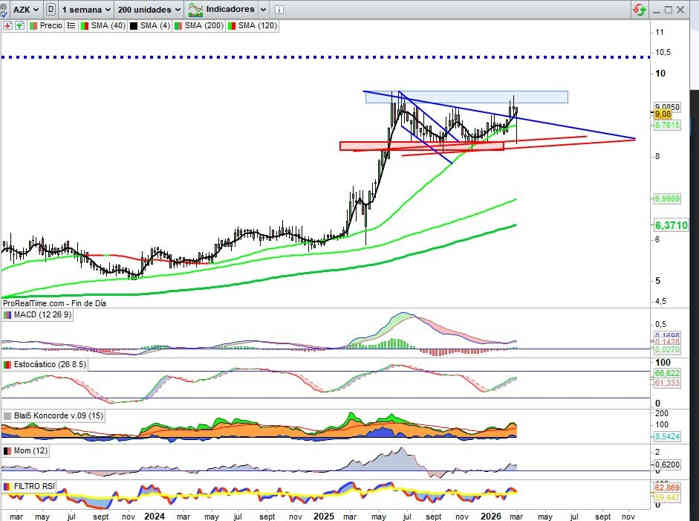 9,08€ +3,42% Hoy. Semana de lo más interesante en el valor en momento técnico clave. -0,87% en lo que llevamos de semana, barrida a zona de control o soporte clave, y cierre de momento por encima del de connotaciones alcistas ya desarrollado en fase de consolidación del valor para relanzamiento alcista.