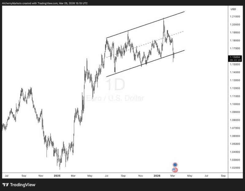El EURUSD está comenzando la sesión a la defensiva tras romper por debajo del límite inferior de su canal ascendente en el gráfico diario, un desarrollo técnico que señala un posible cambio en el momentum después de meses de un aumento gradual. El par ahora cotiza cerca de 1.16 y parece vulnerable a un retroceso más profundo hacia la zona de soporte 1.1530–1.1550, particularmente a medida que se acumulan vientos en contra macroeconómicos para el euro.