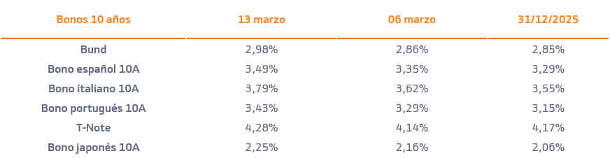 Análisis bonos. El conflicto de Irán se intensifica llevando al precio del crudo (Brent) >100$. Aviva los temores a inflación y presiona las TIR de los bonos a lo largo de la curva, especialmente los tramos largos. En los Treasuries: 2A +16pb (3,72%), 10A +14pb (4,28%), 30A +15pb (4,90%). En Europa, Bund 2A +13pb (2,44%), 10A +12pb (2,98%), 30A +11pb (3,53%Las primas de los periféricos se mantienen relativamente estables.